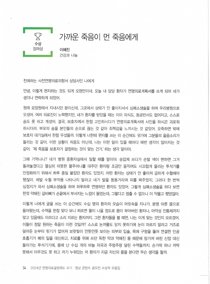 <2024. 12월> '2024년 연명의료결정제도 수기·영상 콘텐츠 공모전' 장려상 수상
