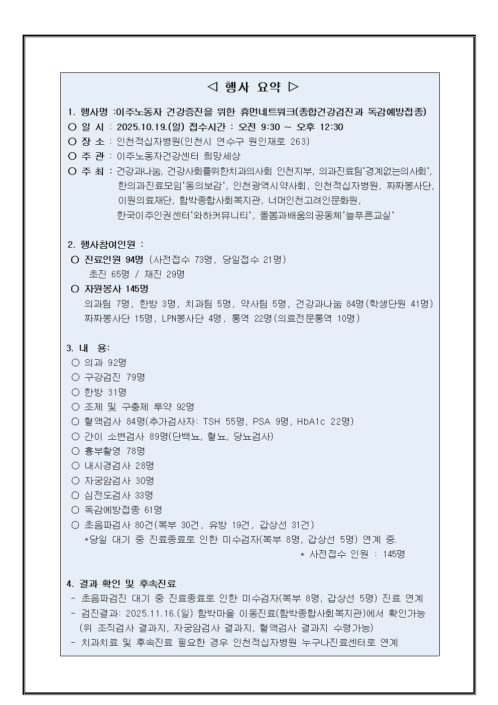 <2025.10월> 이주노동자 건강검진 행사요약 페이지 정보 작성자 관리자 댓글 0건 조회 304회 작성일 25-11-04 16:17 본문 2025.10.19(일) 진행한 이주노동자 건강검진 행사 요약입니다. 목록 다음글<2025.10월> 2025 이주노동자 건강검진 25.11.04
